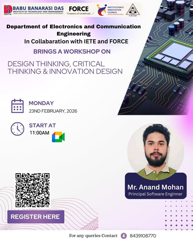Description: Department of Electronics and Communication, BBDITM organized a workshop in collaboration FORCE and IETE on Design Thinking, Critical Thinking & Innovation Design